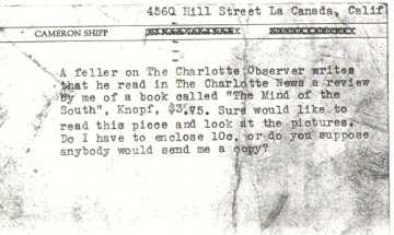 Cash's friend and Mary's cousin, Cam Shipp, sent along this humorous card referring to his own early review of the book which appeared in the News on publication day. By this time, Shipp had quit the News and become a Hollywood publicity agent for Warner Brothers as evidenced by the below letter mailed to Mary a month earlier. (The film to which he refers with Bette Davis and James Cagney was "The Bride Came C.O.D.")