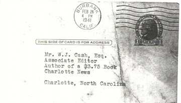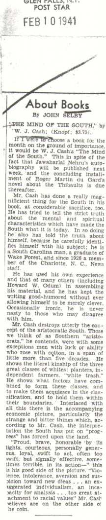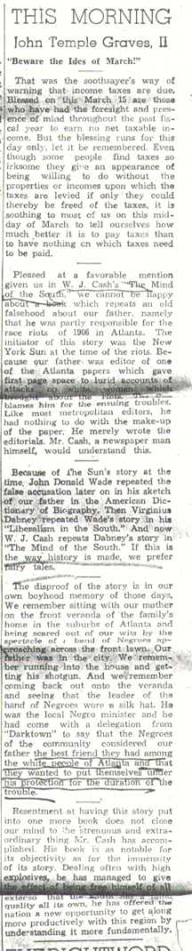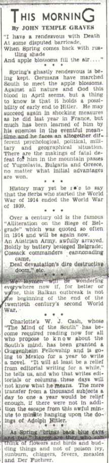 John Temple Graves II, another recipient of an honorable mention by Cash (Mind of South, p. 374), wrote these two pieces below for the Roanoke Times, the piece on the left appearing April 12 and the piece on the right appearing March 15, and then sent them to Cash with the above inscription. His only beef with Cash appeared to be Cash's mention of Graves's father in the book as having been responsible for the 1906 Atlanta race riot resulting from the printing of inflaming editorials in the Atlanta Constitution regarding supposed attacks on white women by black men. Not so said the younger Graves; as chief editor of the paper, his father was not responsible for its editorial content. He shifted the blame for Cash's putative error, however, to the New York Sun, the "originator of the story" at the time. (Cash had attributed the story to Virginius Dabney. (Mind of South, p. 301)) The April 12 piece by Graves is poignant as it announces in print Cash's Guggenheim Fellowship and his intent to travel to Mexico for a year; it begins with the lines from Alan Seeger, the World War I soldier's lament, (said to be one of John F. Kennedy's favorite poems), "I have a rendezvous with Death..."