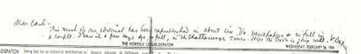 Note and brief piece sent along by Virginius Dabney, well-known editor of the time of the Richmond Times-Dispatch. Dabney had greatly offended Cash a couple of weeks earlier by stating in his review of the book that the first half of the book was slow moving. Cash took offense primarily because Dabney had written to him in the fall requesting to be allowed to be one of the first to review it. Cash had also given praise to Dabney for his courageous editorial stands in support of the 1938 federal anti-lynching legislation and against the poll tax. (Mind of the South, pp. 339, 373) Cash dashed off an angry letter to Dabney immediately followed by an humble and embarrassed apology over the first tirade. Dabney responded with an "incident forgotten" letter, followed by this friendly offering. The note above reads: "Dear Cash- This much of an editorial has been republished in about six Va. newspapers and in full in a couple. I saw it a few days ago, in full, in the Chattanooga Times. Hope the book is going well. V. Dabney"