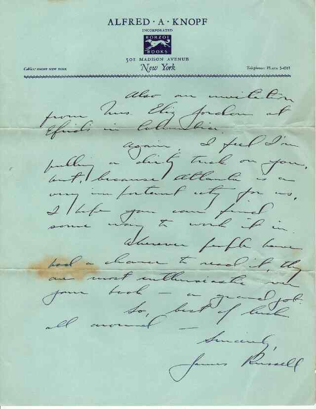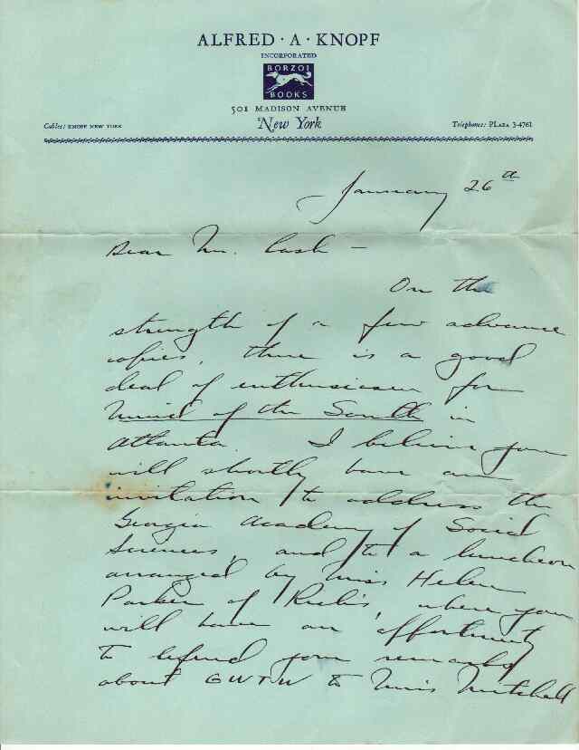 Letter from Knopf editor James Russell to Cash in January outlining early praise for book and suggestions for post-publication publicity. (Note the quite accurate prediction that Cash would shortly get the opportunity "to defend [his] remarks about GWTW to Miss Mitchell".)