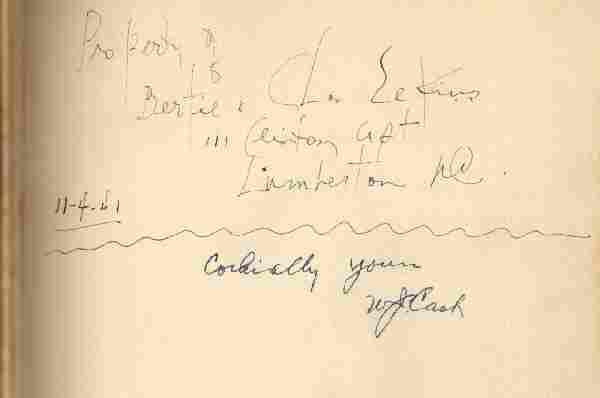 Signed first edition owned by Cash's sister and brother-in-law. This particular volume was presented posthumously in November, 1941, explaining the lack of a more personal salutation by Cash to his beloved sister at whose wedding in June, 1939 "he cried like a baby". Cash's family assumed that there would be plenty of opportunity to receive an autographed copy after his return from Mexico.