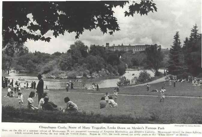 The grounds of Chapultepec Castle in Mexico City, just a short walk from the apartment rented by Wibur and Mary in mid-June. The expansive park, once home to Maximilian and Carlotta, served as a place of afternoon comfort during the last two weeks of Cash's life. (Photograph from National Geographic, August, 1940) |
