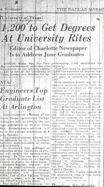address on Monday evening, June 2. The university student newspaper,The Summer Texan, reported the next day, "The moon shone brightly and the tower burned orange Monday night as 1,339 students sat in front of the Main Building to receive their degrees and to be told that as Southerners they must mix clear headed common sense with their traditional courage and pride." It also added, however, that Cash's "speaking ability does not equal his writing talent".(Hear and read "The South