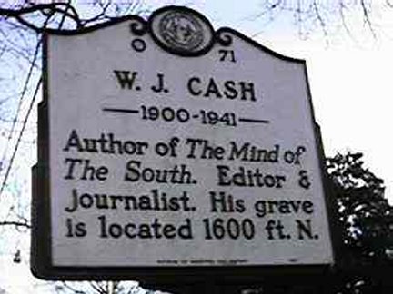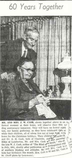 Posing beside the Mayflower Cup on December 30, 1956, Nannie and J.W. celebrated their 60th wedding anniversary. They would have two more before Nannie's death in August, 1959. (Photo from the Shelby Star) Both went to their graves firmly believing that their son was murdered in Mexico by Nazi agents and/or Klan sympathizers. From 1942 until Nannie's death, they lived on Sumter Street in Shelby, just behind the large home occupied by Governor and Senator Clyde R. Hoey. As a result, many luminaries, even including President Roosevelt on one occasion, would visit, more or less, right in the Cashes's own backyard. Hoey, succeeded in the Senate at his death by Sam J. Ervin, was buried in 1954 thirteen feet from the grave of W. J. Cash. |