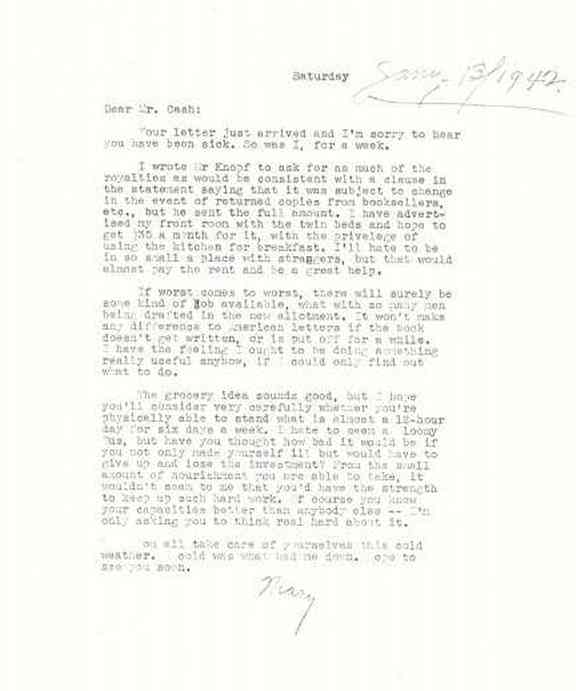 Letter from Alfred Knopf to J.W. Cash, indicating he would inform the elder Cash of the book's sales from time to time. After some consideration, the Cashes allowed Mary to retain rights to the book as widow; she eventually sold the rights to Knopf for $100 in the late Sixties. |