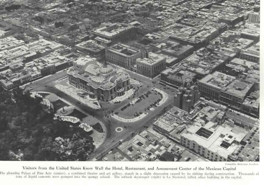 The Palace of the Fine Arts, also near the Cashes' apartment, stands then as now at the center of Mexico's busy central plaza on the edge of Chapultepec Park; the stubby building to the right, La Nacional, was then the tallest "skyscraper" in Mexico. The then-new Hotel La Reforma, razed in the early 1980's, was nearby, probably visible in the upper portion of this photograph. (Photograph, National Geographic, August, 1940) And as Palacio de Bellas Artes appears today... |