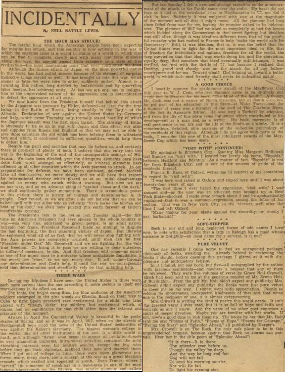 Nell Battle Lewis's piece of December 14, 1941, praising the award of the Mayflower Cup to Cash. |