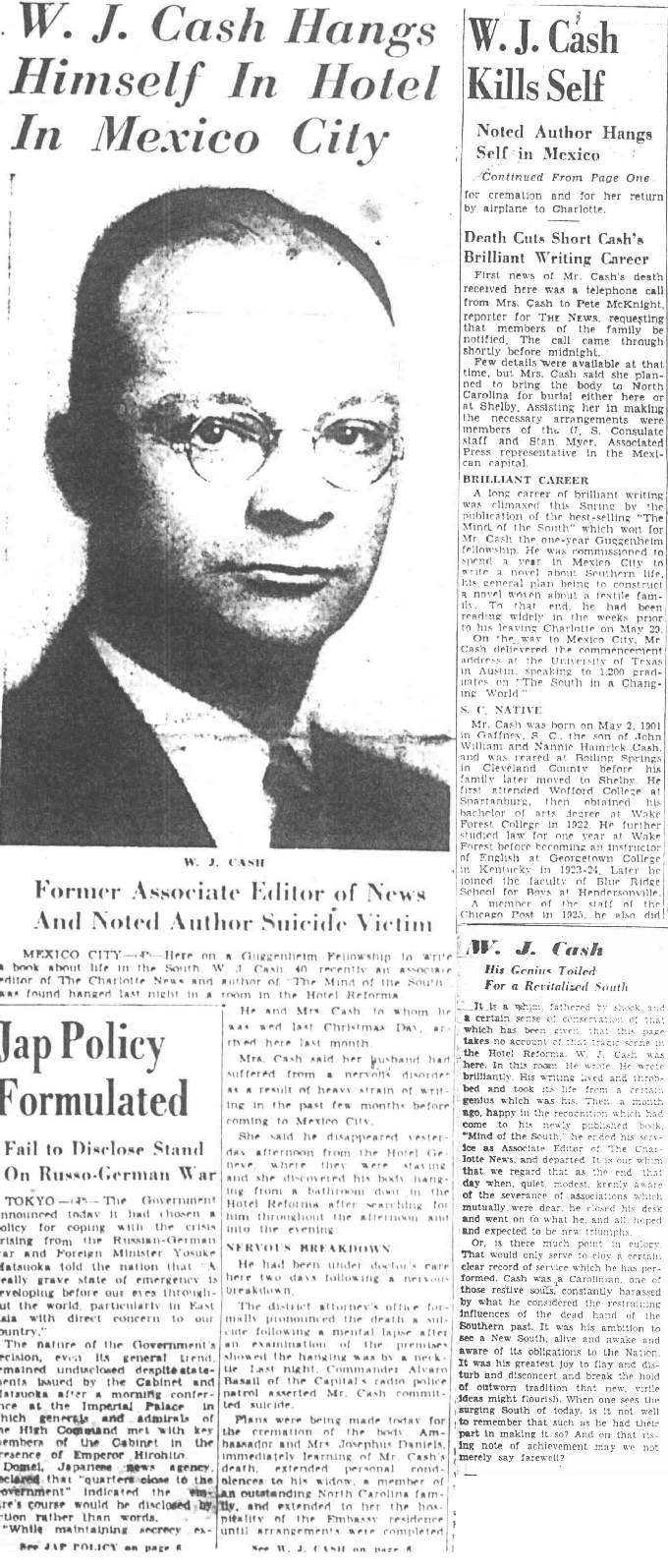 cause of death. In times where nearly half the population of Mexico had pro-Nazi leanings as evidenced by the 40% vote the previous summer for the fascist-backed presidential candidate, for anyone today or then to believe that the Mexico City Police Department would have provided a thorough, unbiased investigation into the death of an American journalist who could easily be passed off as a deranged suicide is to engage in fantasy beyond belief. Indeed, after a deal made with the Texas-Louisiana oil man, William Rhodes Davis, the Mexican government had shipped massive quantities of expropriated American and British oil to the Nazis from 1938 until the invasion of Poland in 1939 and would have continued to do so but for a British blockade preventing shipments into Germany. In return, Mexico received industrial goods from Germany. The Mexican government was trying to walk a tight rope between not overly offending the United States, its geographical ally, and also not offending Germany, its historical economic ally. Meanwhile, the United States was trying not to do anything which would inexorably bring it into the War. The Cashes realized that just a week earlier the Nazi war machine had invaded Russia and was moving steadily toward Stalingrad. There was heavy debate in Congress that very week over whether the United States should now enter the War. Any slight fuse ignited then and there could create problems--far beyond Shelby. If Mexico was crawling with Nazi agents who could kill American journalists at will, what next? Mr. Daniels was a North Carolina legend and a friend and Mr. Roosevelt still called Daniels, his old Navy Department boss, "Chief". The Cashes would have to abide in faith for the sake of more important matters. Cash was buried in Sunset Cemetery in Shelby on Monday, July 7. Nothing remains of his