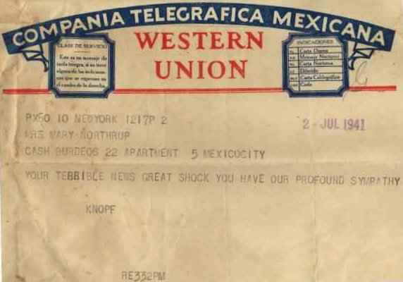 Telegram from Knopf sent at 12:17 p.m. July 2, 1941 expressing sympathy to Mary. Indicative of how fast word had spread of Cash's death, this telegram was sent from New York just twelve hours after the discovery of Cash's body.