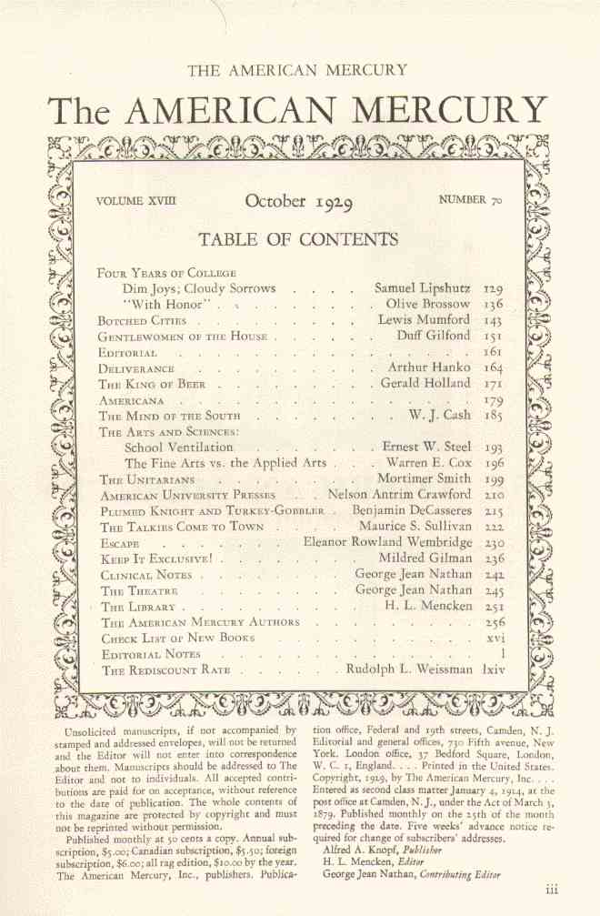 The Table of Contents of the original October, 1929 American Mercury, containing the article entitled, "The Mind of the South"