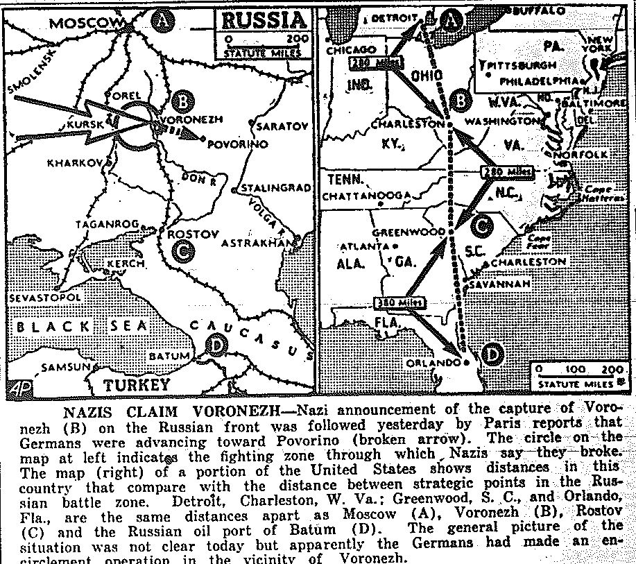 Map of Russia Compared to Map of the United States, Taking of Voronezh, published July 8, 1942