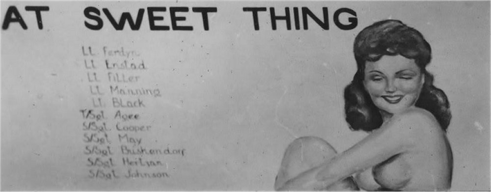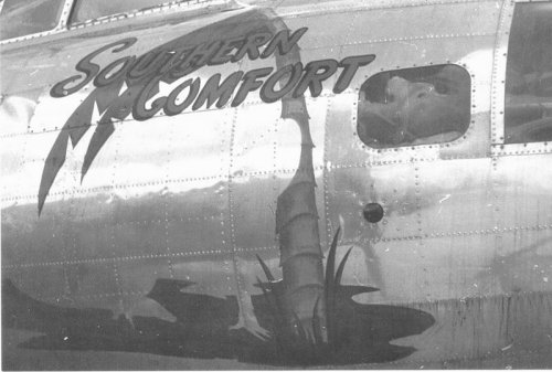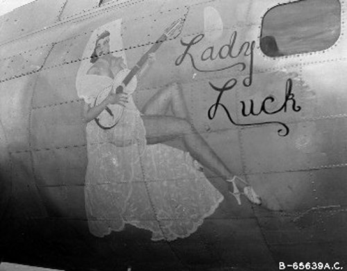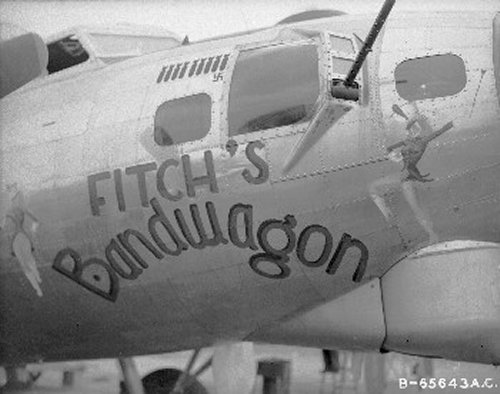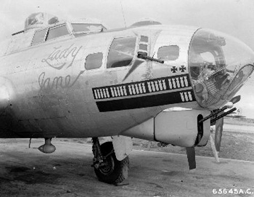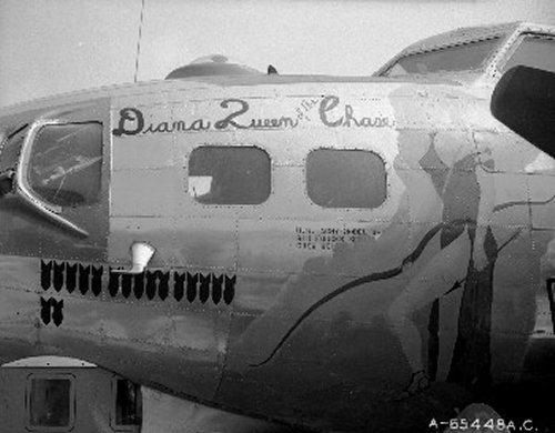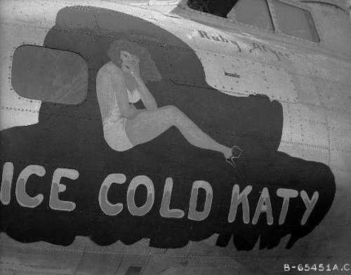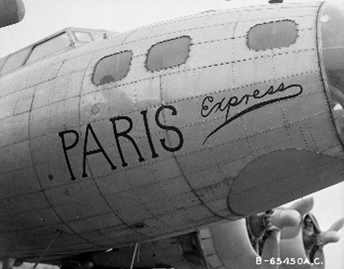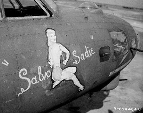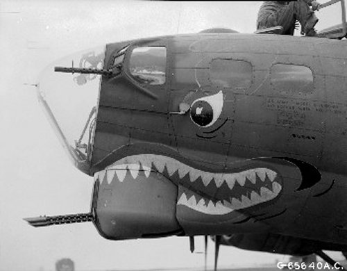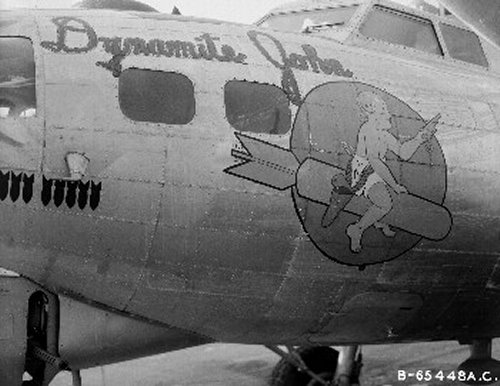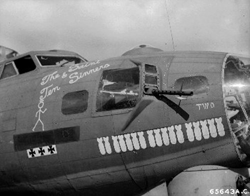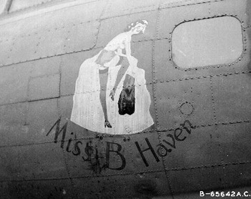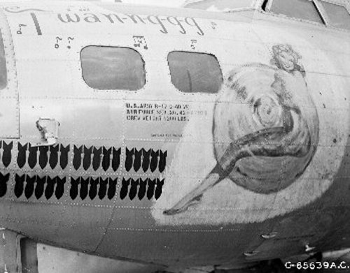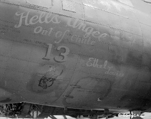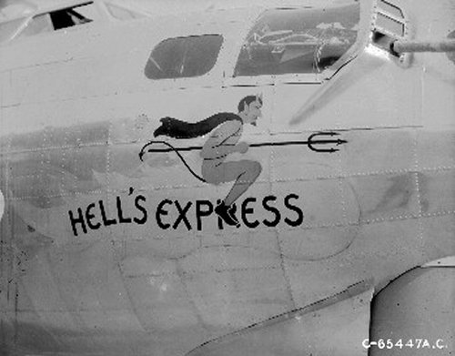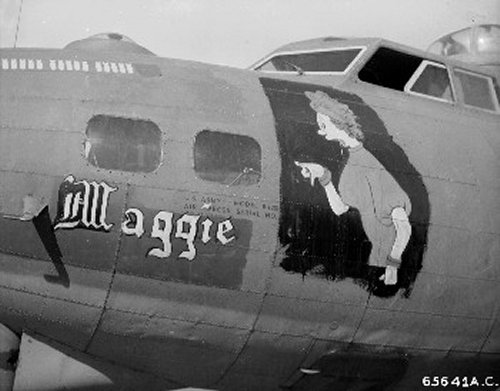 For your edification, we provide below some Nose Art and Wall Art, that exhibited for each squadron in the mess, of the 401st Bomb Group, of which "Maggie", "Hell's Angel Out of Chute 13", and "Paris Express" flew among the 28 Flying Fortresses of that part of the Group, the 612th through 615th Squadrons, which winged the mission over Oschersleben of January 11, in which Major Howard distinguished himself as a Roland for bravery in protection of its tail. Those of the Group which did not return from the mission were the "Pee-Tey-Kuh", "Carolina Queen", and two Fortresses unnamed, apparently not among those being protected by Major Howard's relentless derring-do, even after he ran out of ammunition, chasing away a Nazi racket-pocking mama on sheer Nose bluff.