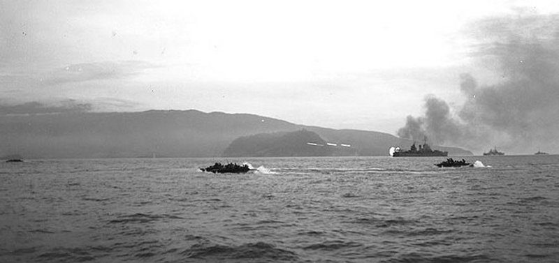 Landing vessels approaching Tanahmerah Bay at Hollandia, April 22, 1944