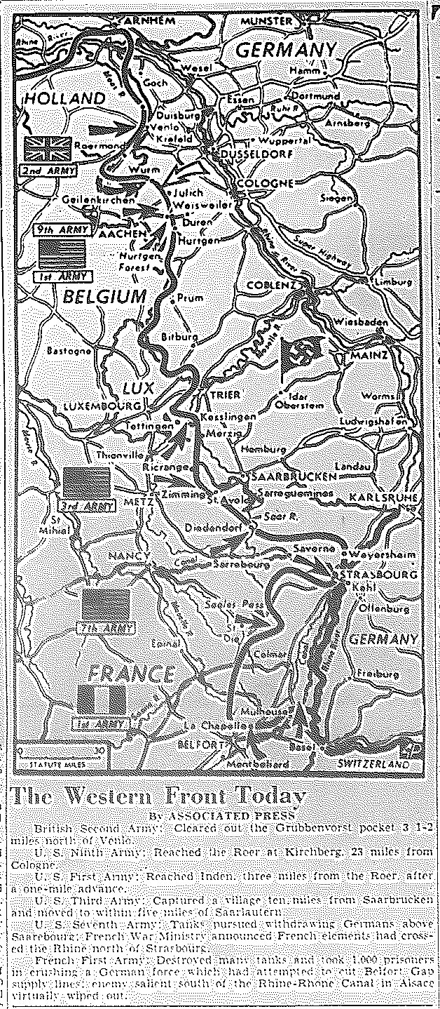U.S. 1st Army at Inden; U.S. 3rd Army Approaching Saarbrucken and Saarlautern;