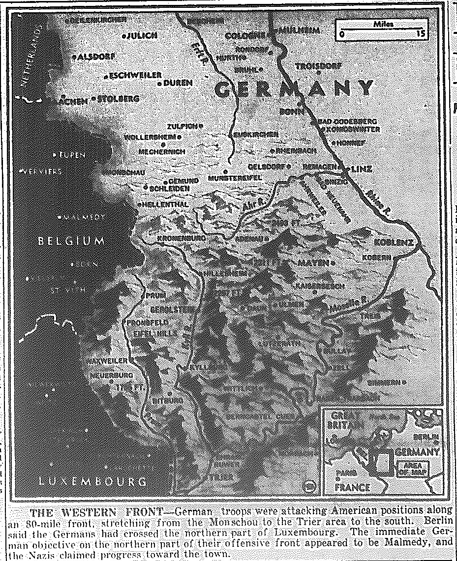 Map of Battle of the Bulge: German Counter-Offensive Along 80-mile Front from Monschou to the Trier Area, published December 18, 1944