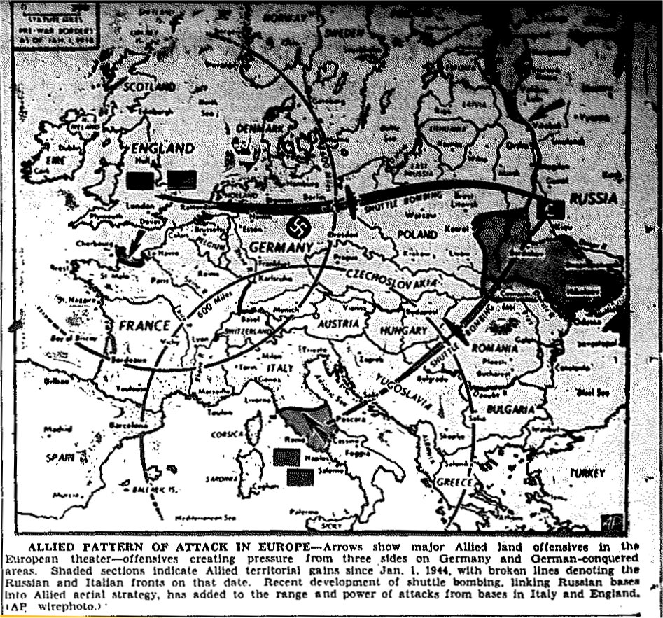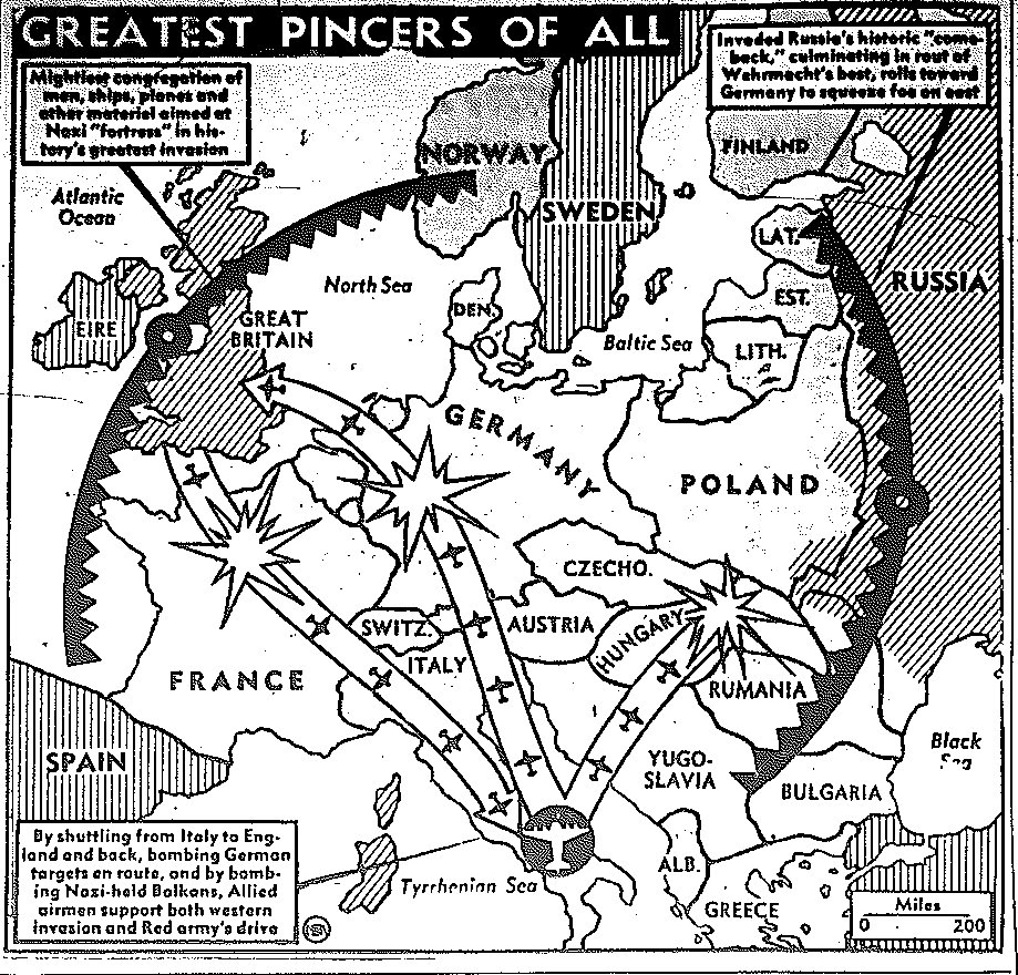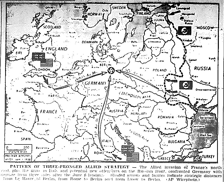 Map of Three-Pronged Approach to Invasion of Germany, from France, Italy, and Russia, published June 7, 1944