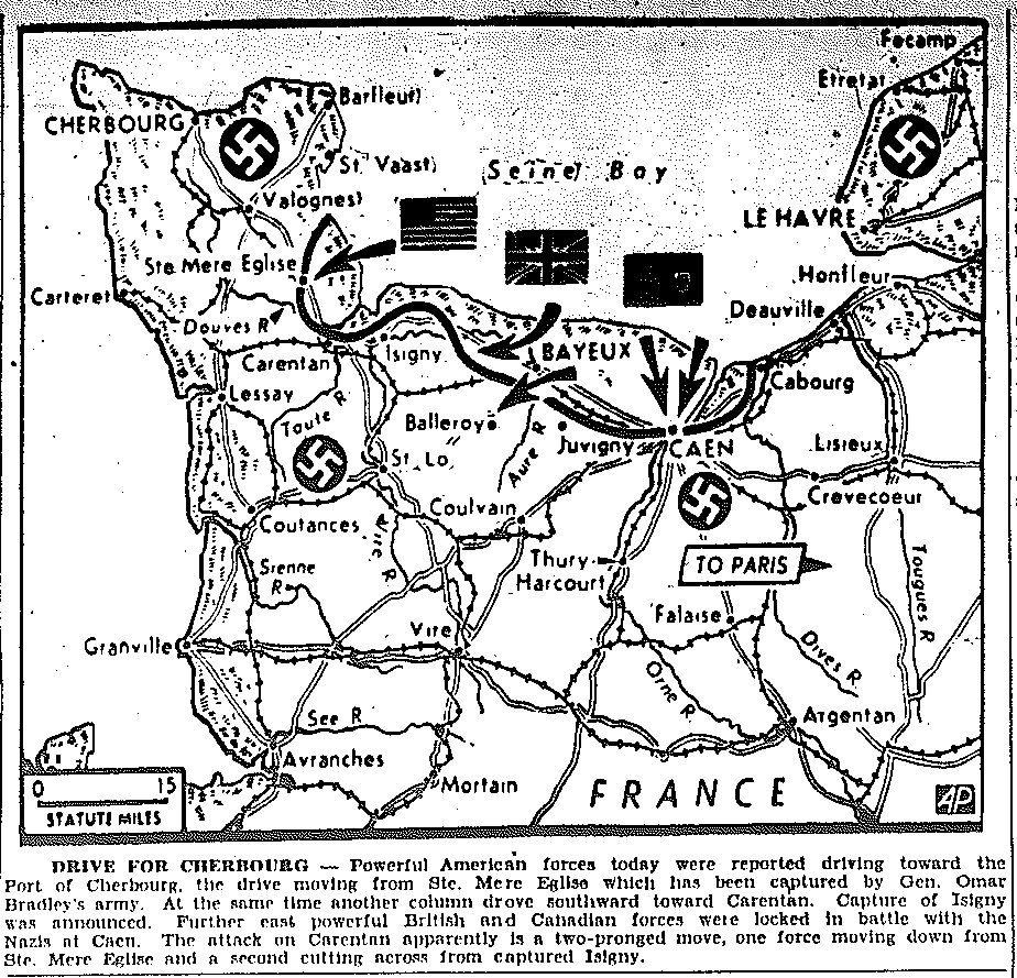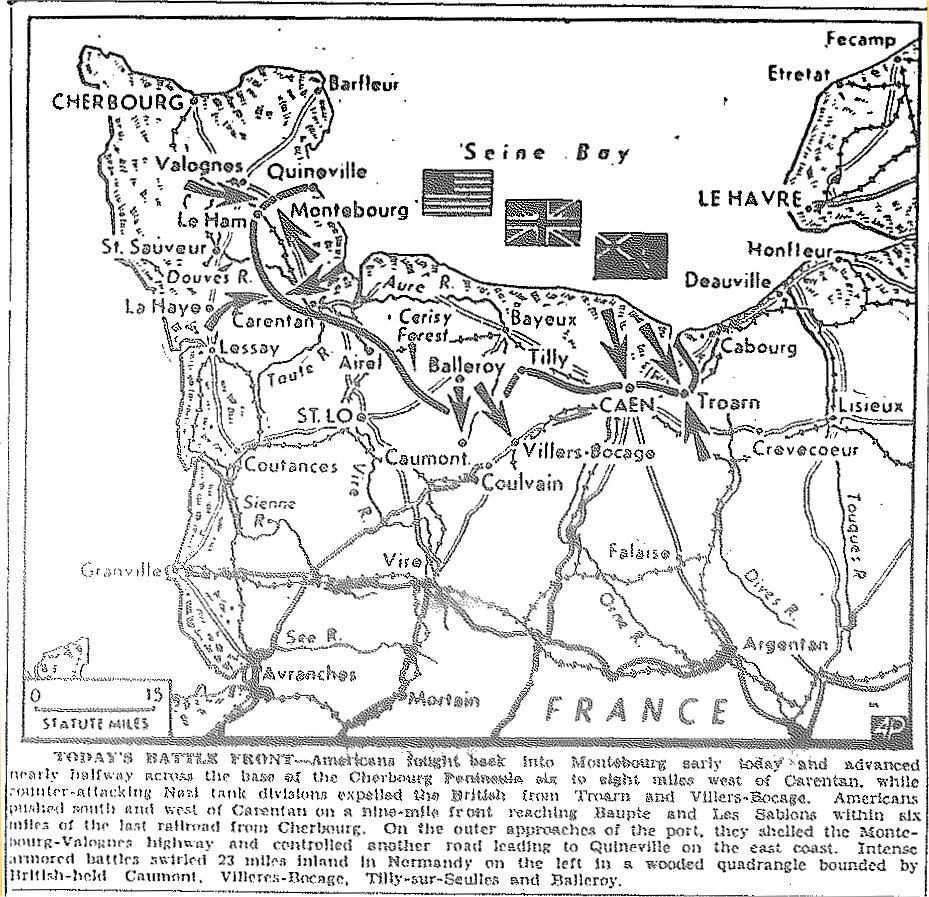 Map of Drive for Cherbourg, Battles for Caen and Montebourg, published June 14, 1944
