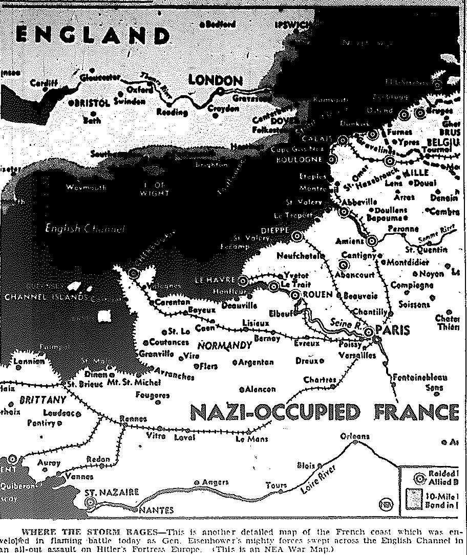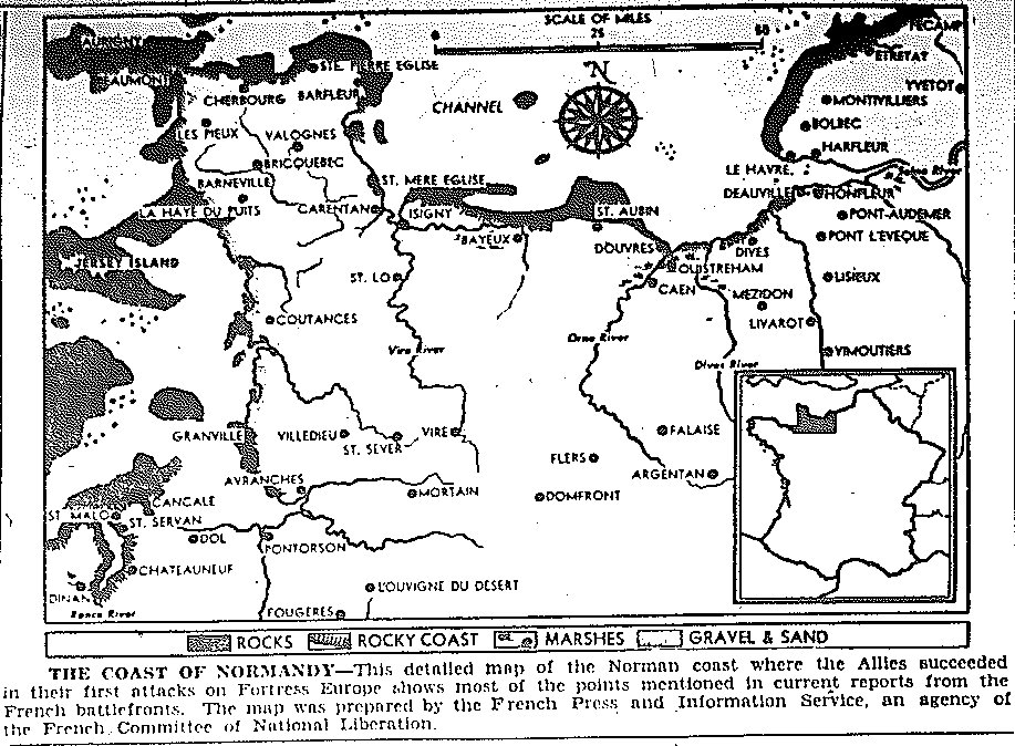 Map of D-Day Invasion of Normandy Coast, published June 8, 1944