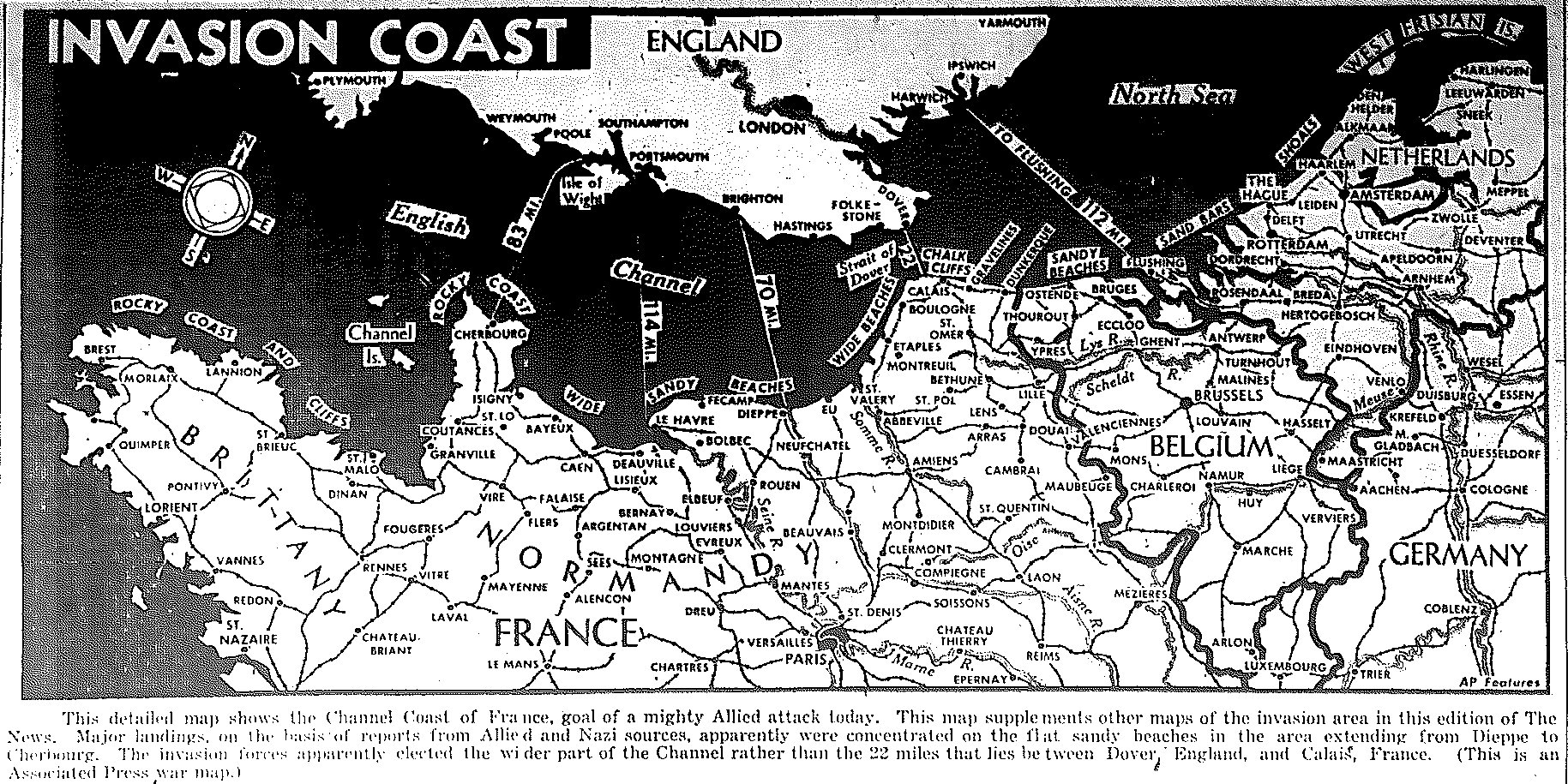 Map of D-Day Invasion of Normandy Coast, published June 6, 1944