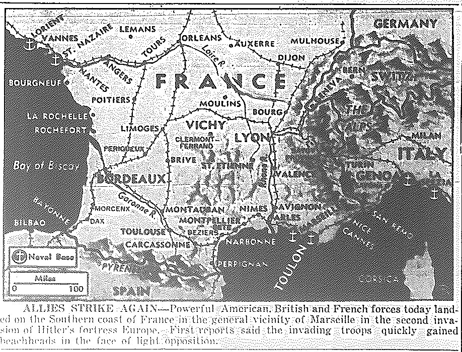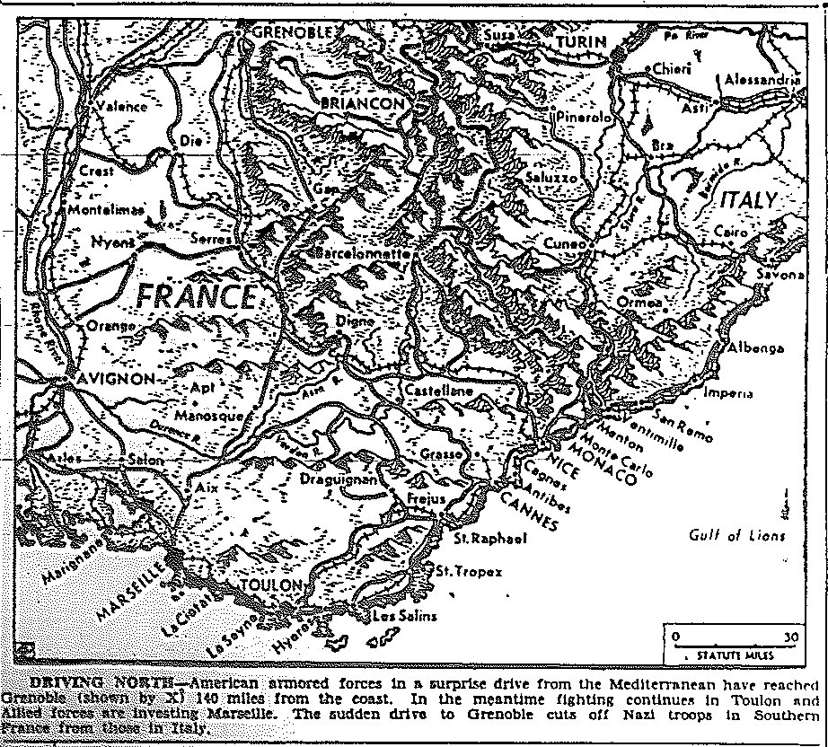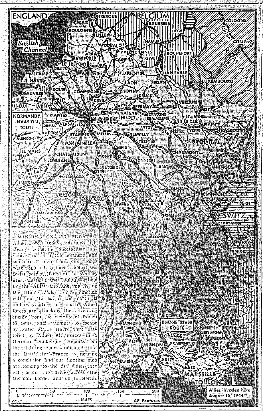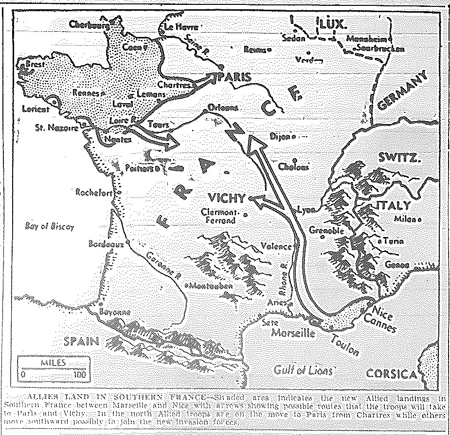 Map of Allied Approaches to Paris and Vichy from Landing Points at Marseilles and Nice, published August 16, 1944