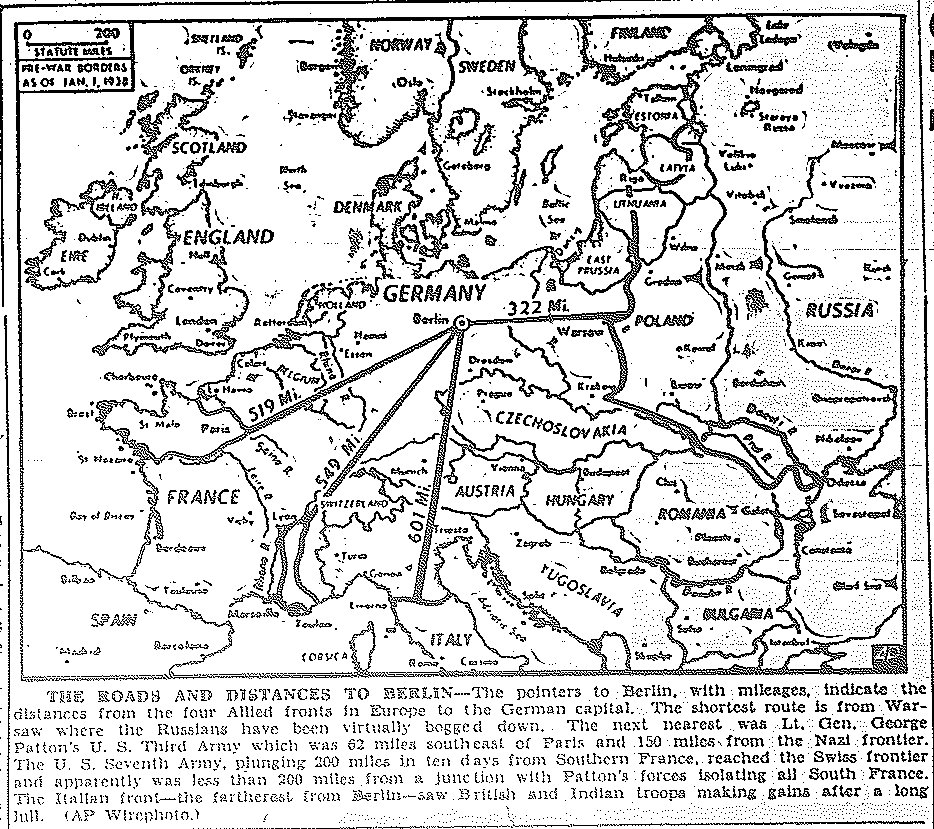 Map of Four Approaches and Mileage to Berlin, published August 25, 1944