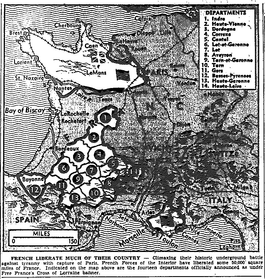 Map of France, Taking of Paris, French Forces Successfully Liberate 50,000 Square Miles with Aid of Underground, published August 25, 1944