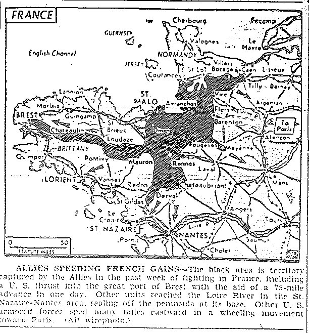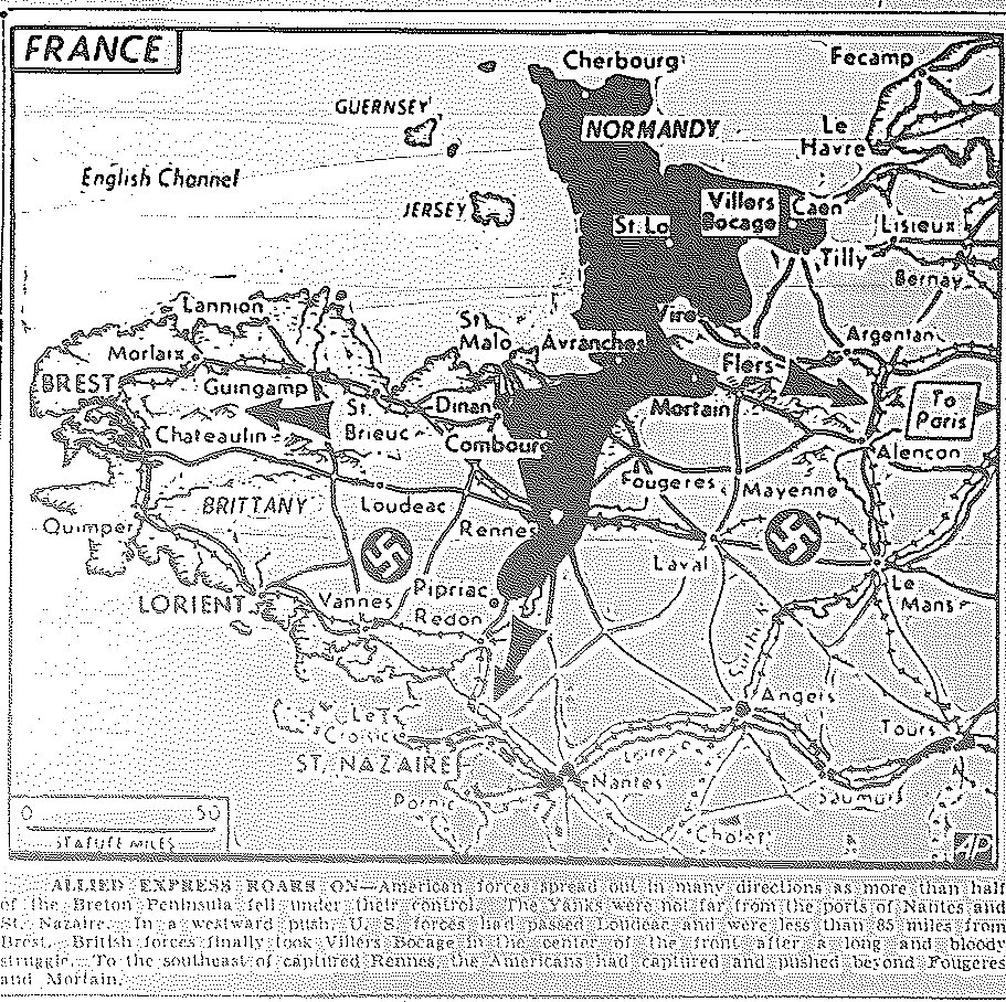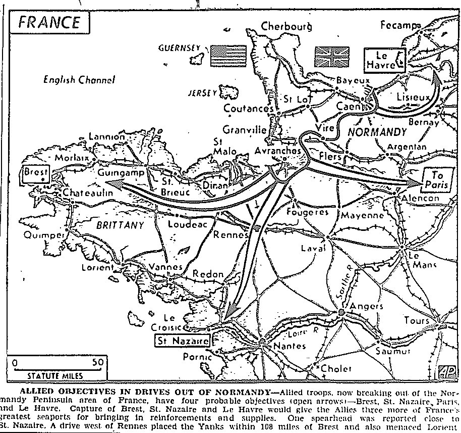 Map of Move Toward Nantes, St. Nazaire, and Brest on Breton Peninsula, and to Le Havre and Paris, published August 4, 1944