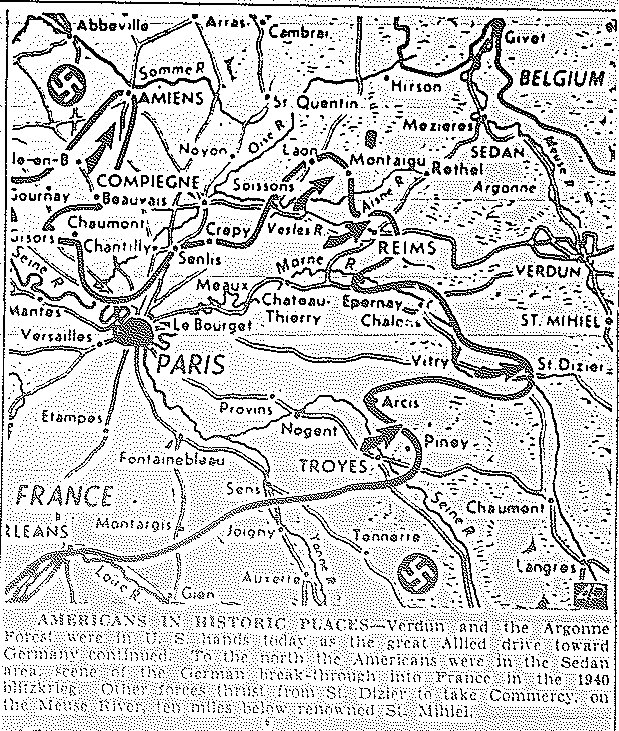 Map of Taking of Verdun and Argonne Forest, Americans in Sedan and Commercy, published September 1, 1944