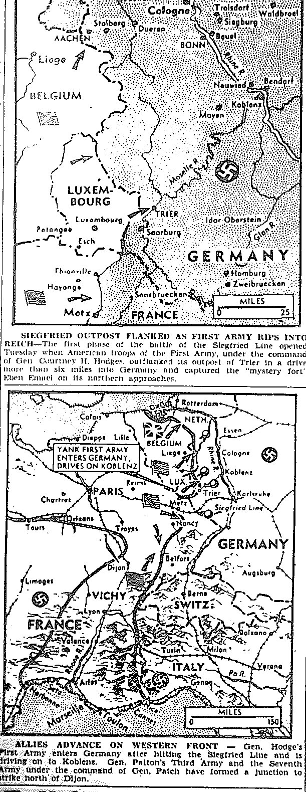 Maps of First Penetration of Siegfried Line at Trier; Third Army Joins with Seventh Army, Moving Toward Belfort, published September 13, 1944