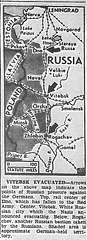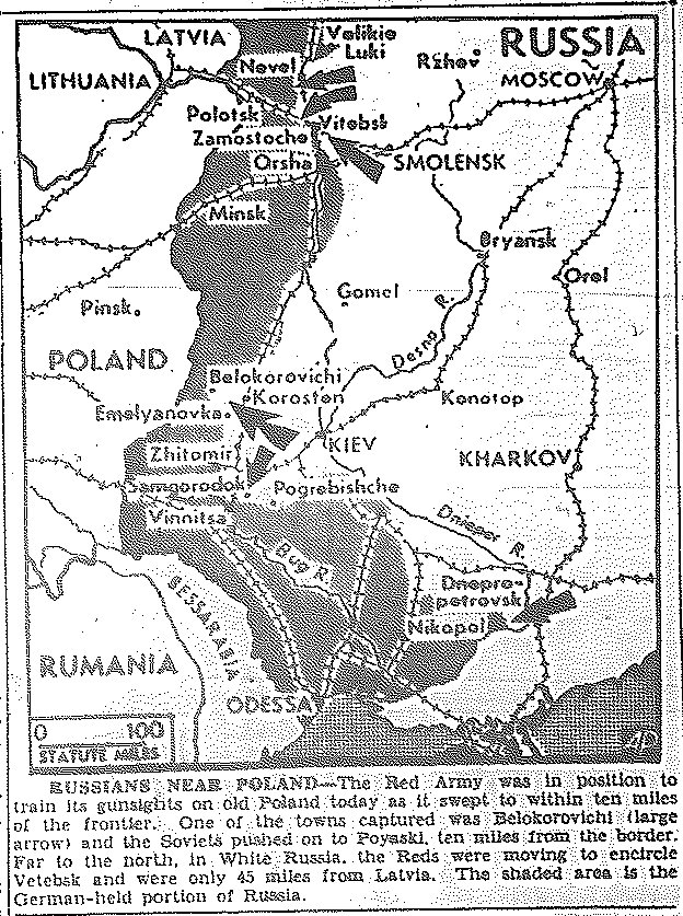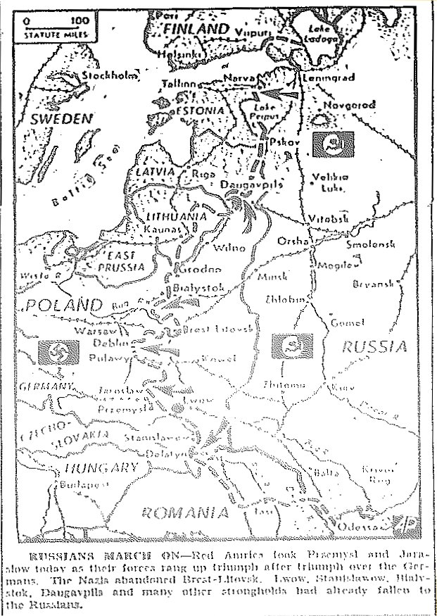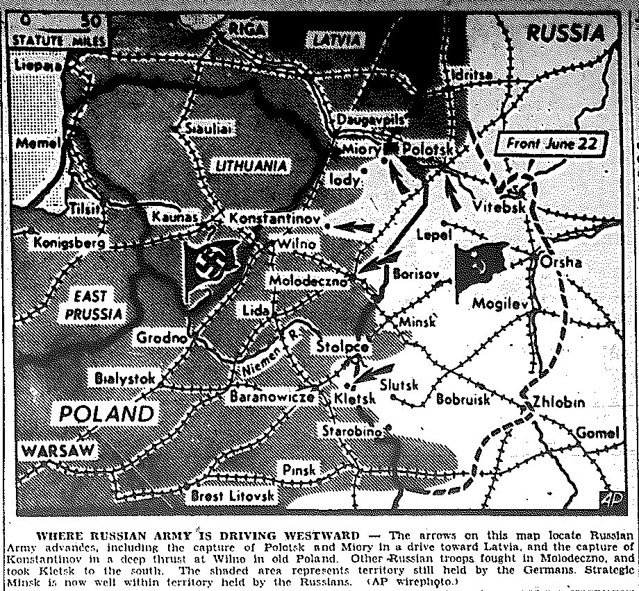 Map of Russia, Poland, Russian Drives toward Latvia, Wilno, and Warsaw, published July 6, 1944