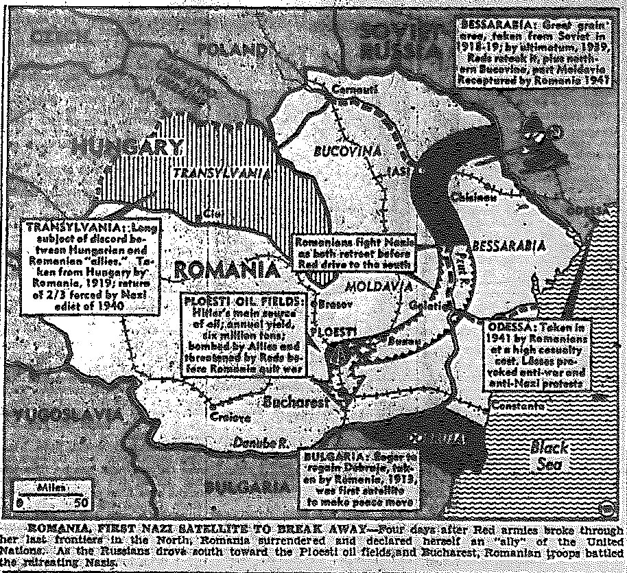 Map of Rumania, Surrender and Fighting of Rumanians with Allies, published August 25, 1944