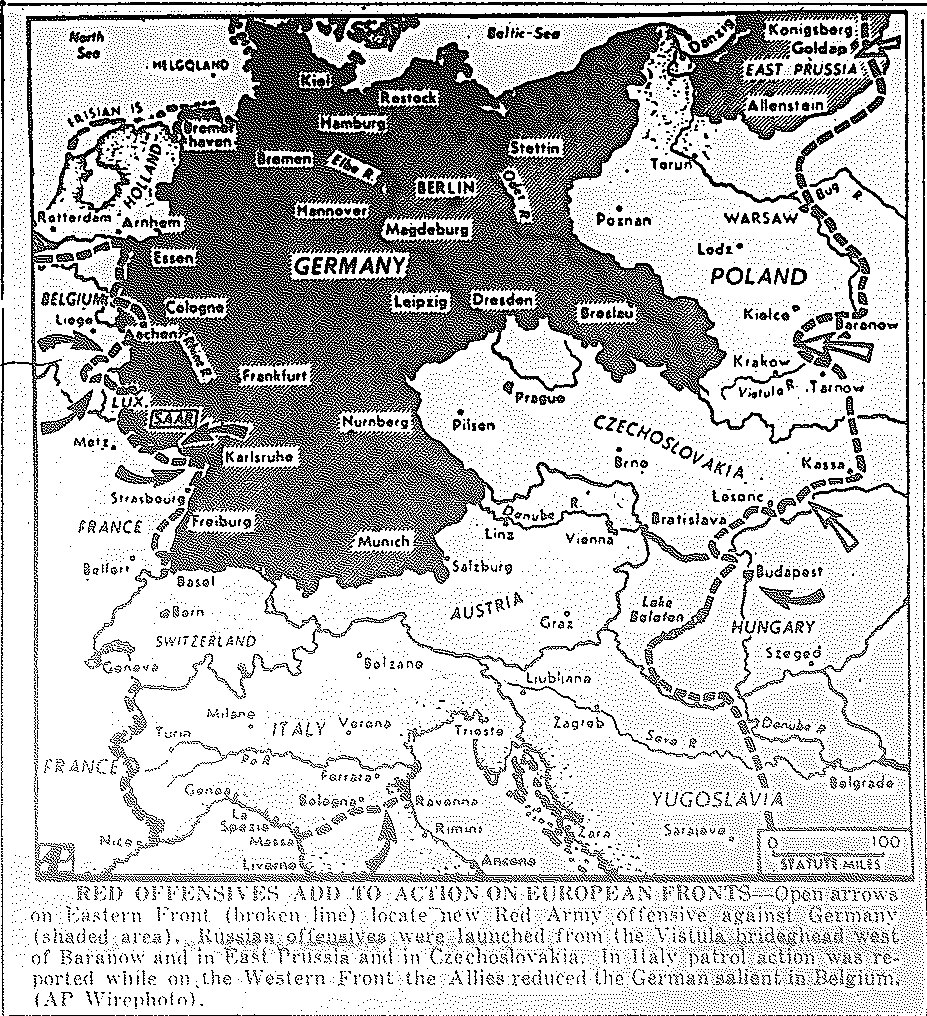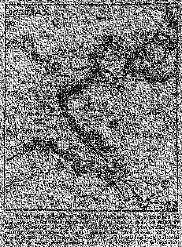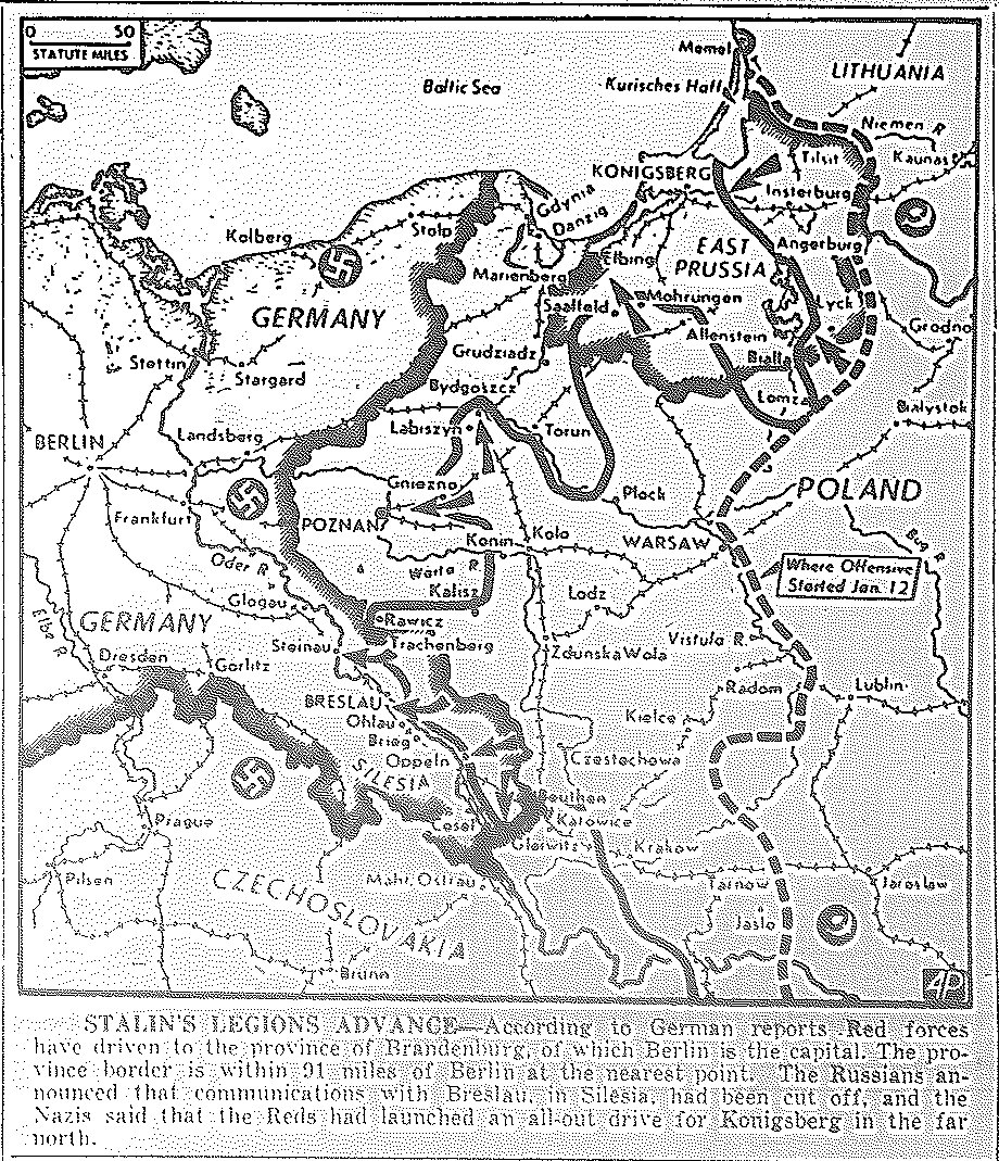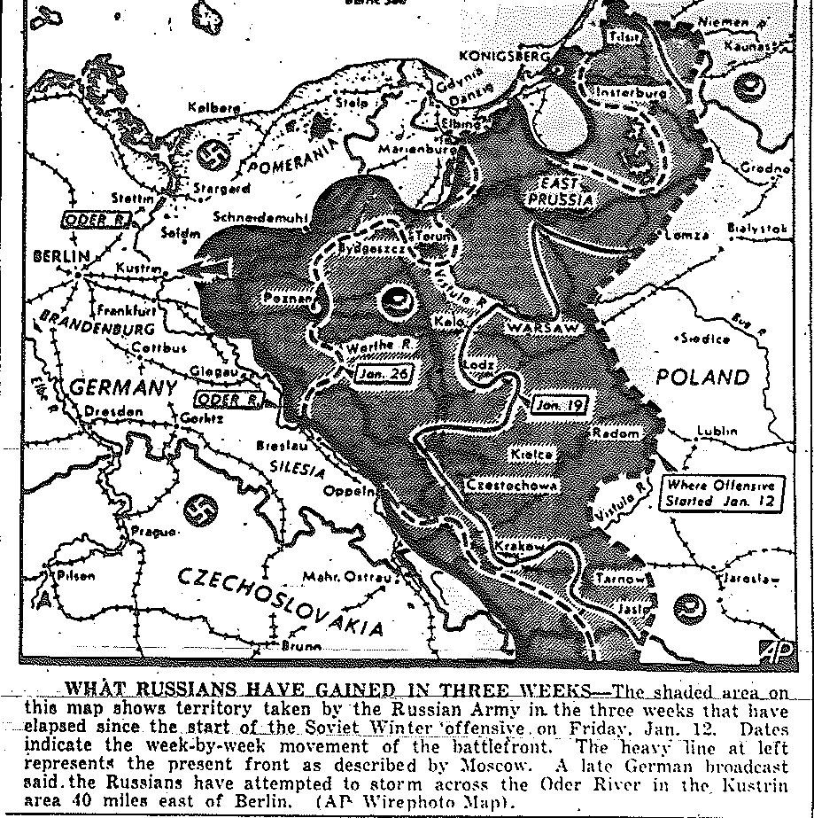Map of Eastern Front, Gains Since Jan. 12 Start of Winter Offensive, published February 3, 1945