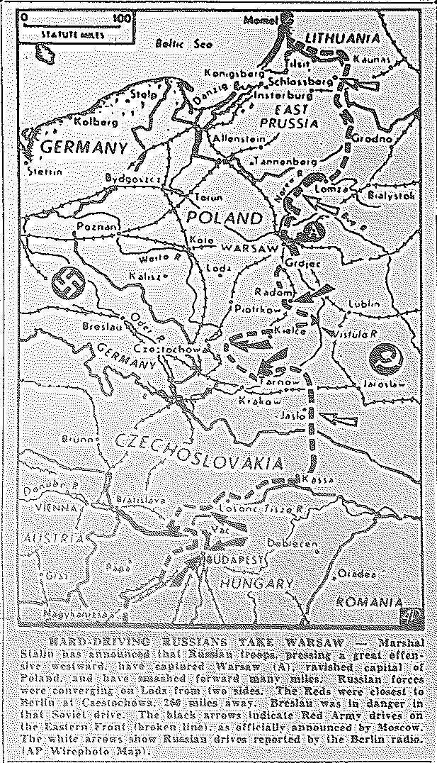 Map of Taking of Warsaw, Approach to Lodz, Breslau, published January 18, 1945