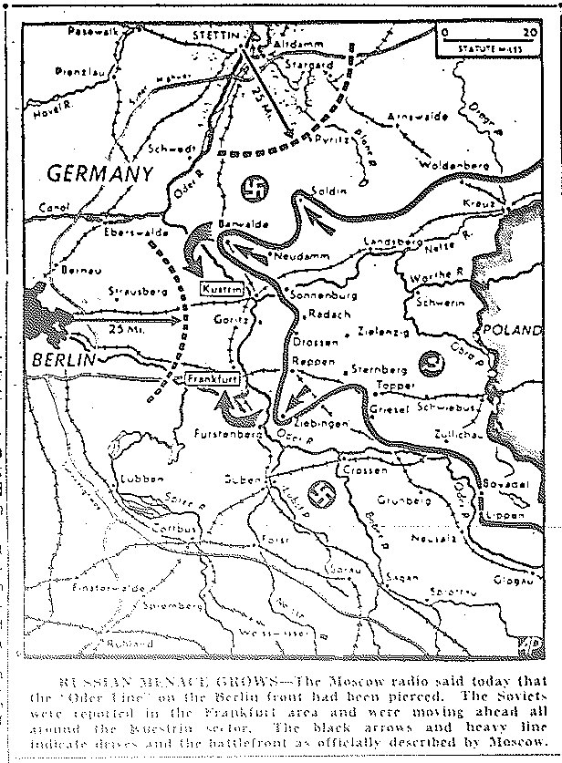 Map of Eastern Front, Russian Attacks Along Oder; Kuestrin-Frankfurt Line Overrun by Soviets;