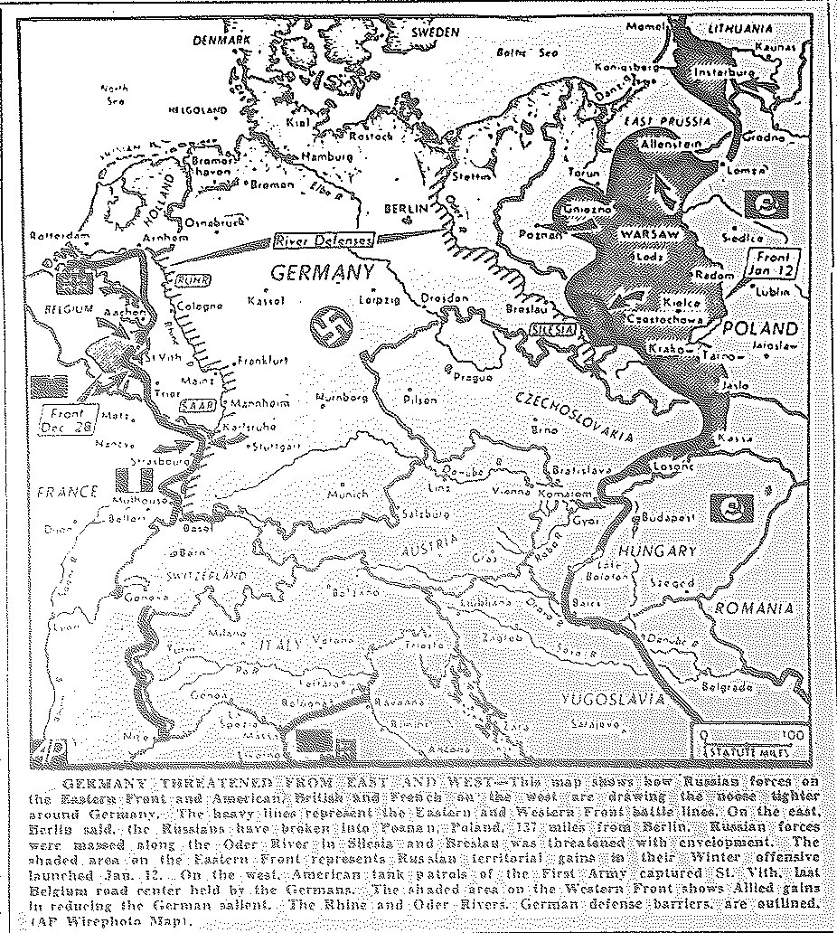 Map of Western and Eastern Fronts Squeeze of Germany, published January 24, 1945