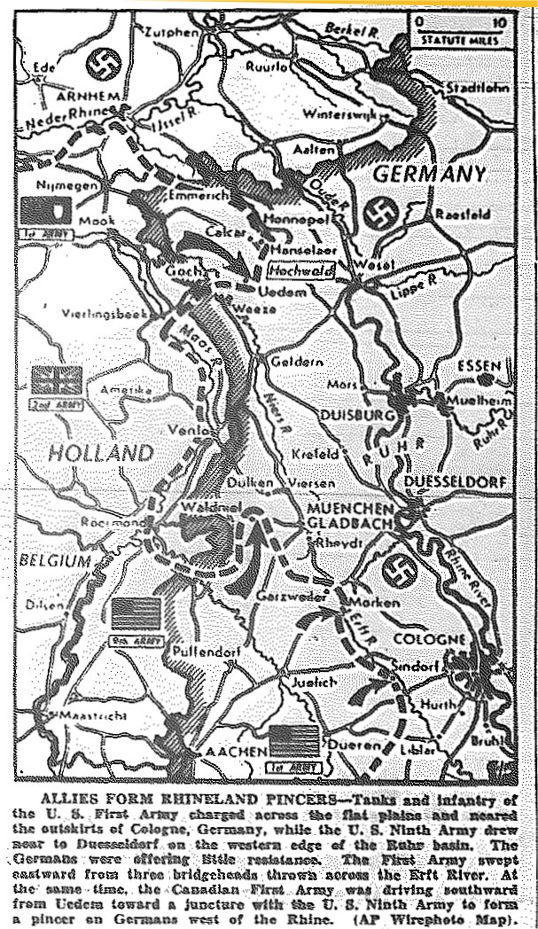 Map of Western Front, Ninth Army joins Canadian First north of captured Krefeld;