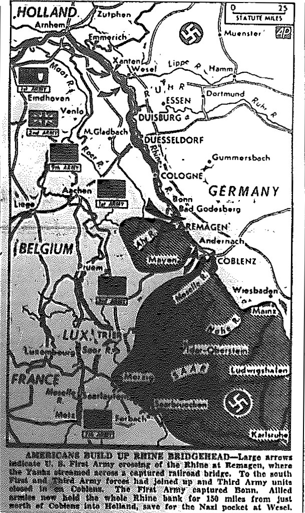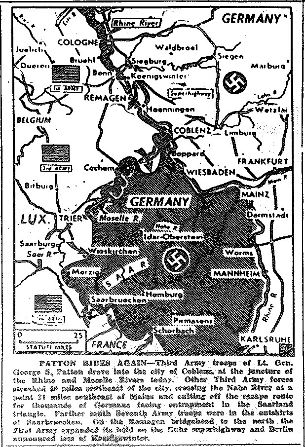 First and Third Armies close on Coblenz, control 150 miles of Rhine, published March 10, 1945