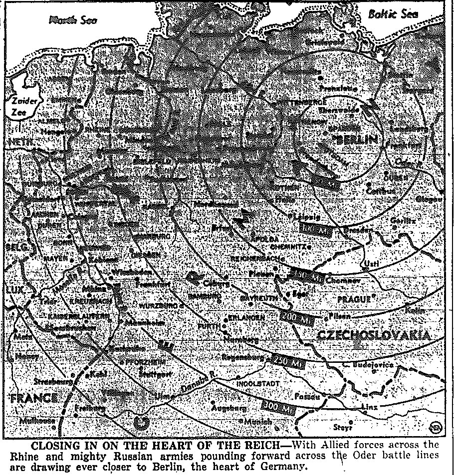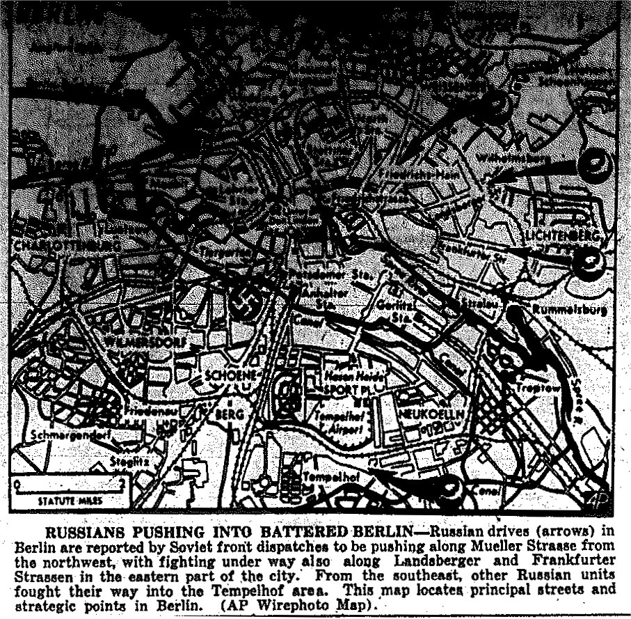 Russians and Third 25 miles apart; Russians begin siege of Berlin,