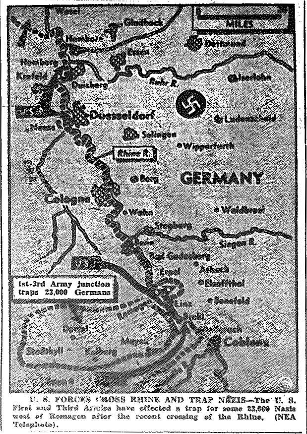 Map of Western Front, First and Third Armies trap 23,000 Germans west of Remagen, published March 12, 1945