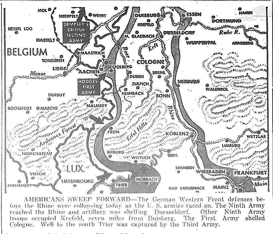 Map of Western Front, U.S. First and Ninth to Cologne and Dusseldorf,