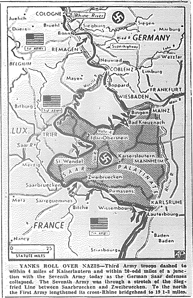 Saarbruecken and Zweibruecken; First extends bridgehead to 19.5 miles, published March 20, 1945