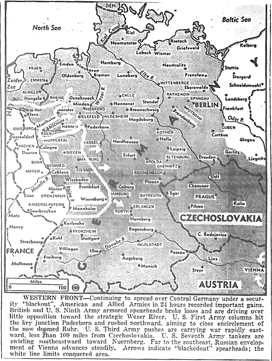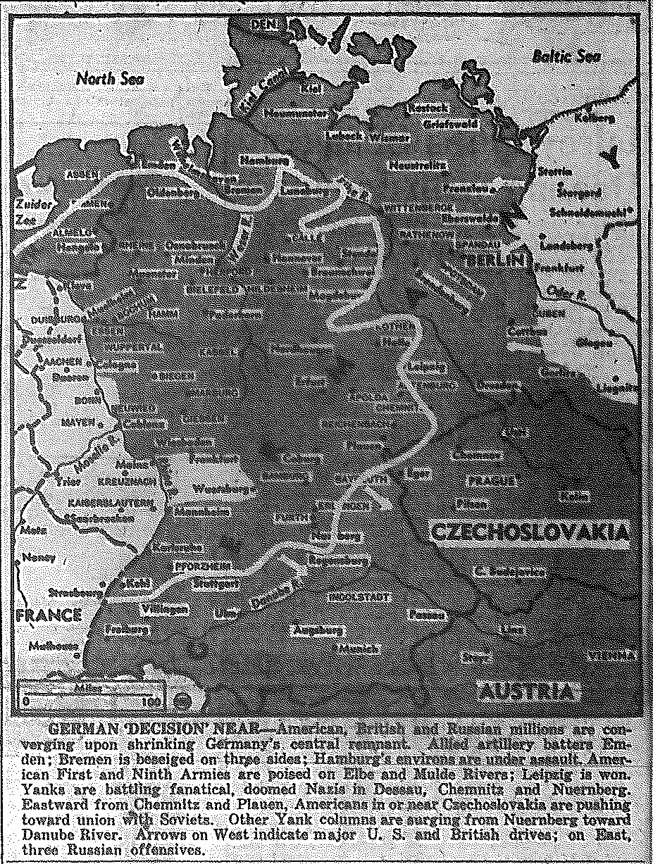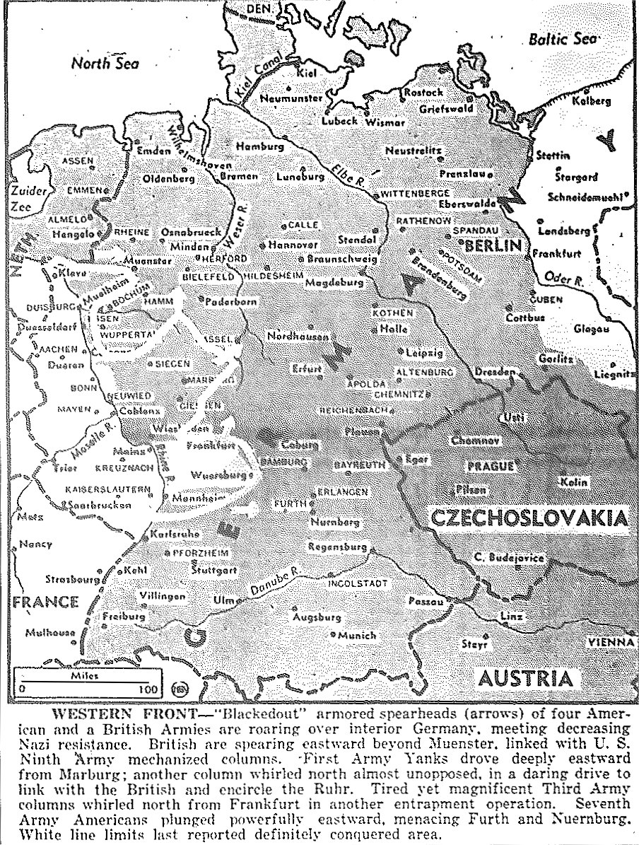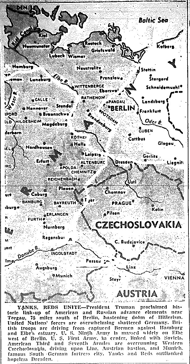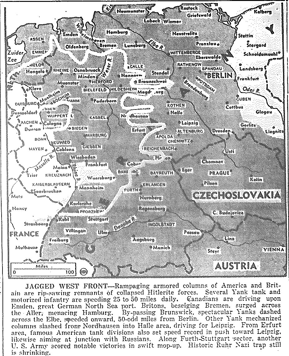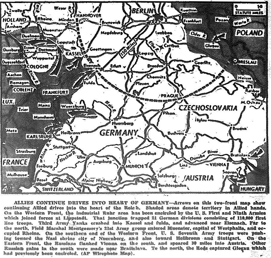 Americans across Elbe, move on Halle and Leipzig, 50+ miles from Berlin, published April 12, 1945