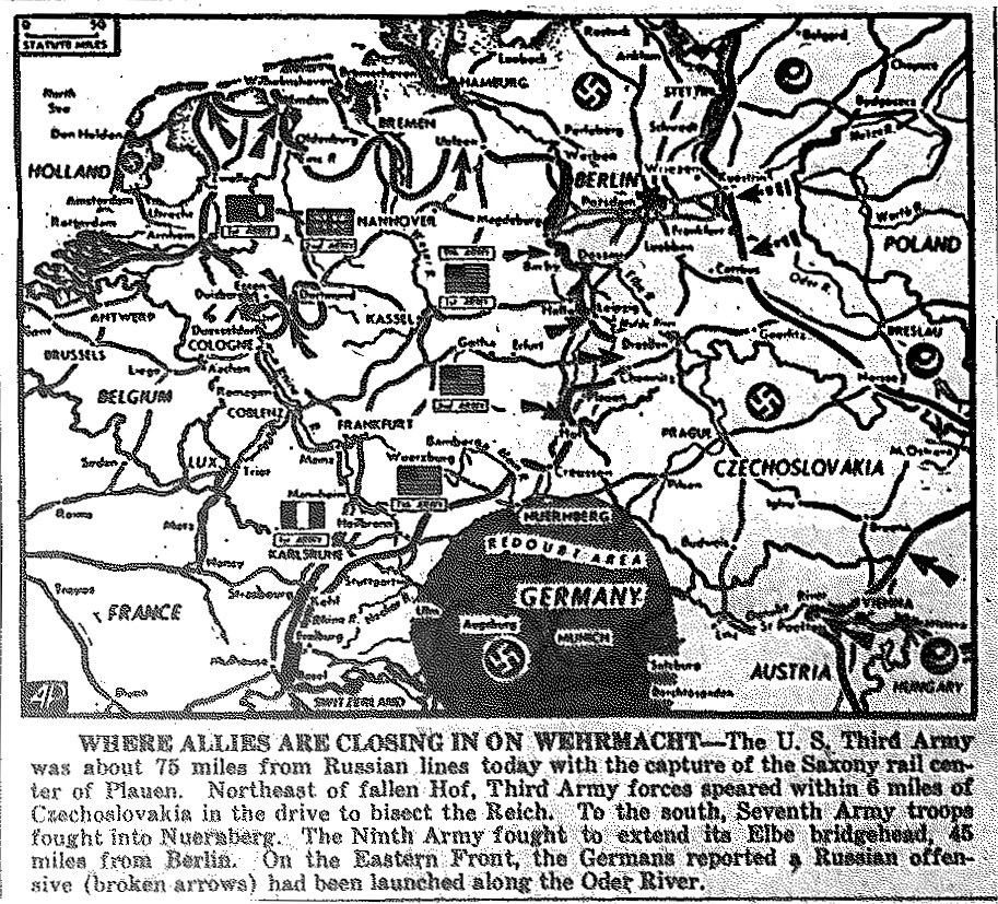 Third captures Plauen, 75 mi. from Russian lines, 6 mi. from Czech border; Seventh in Nuernburg;