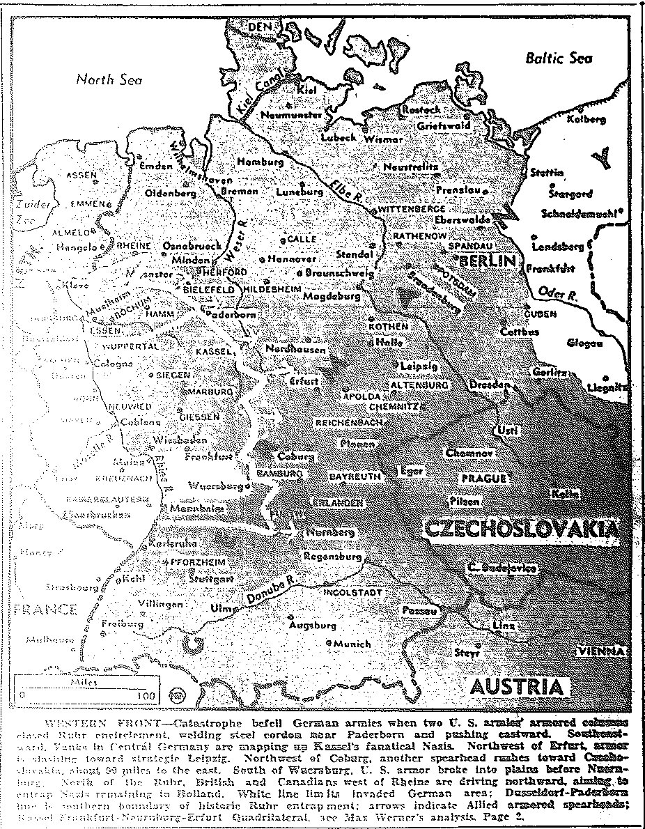 Ruhr closed off; Third Army spearheads into Kassel, toward Leipzig, Czechoslovakia;