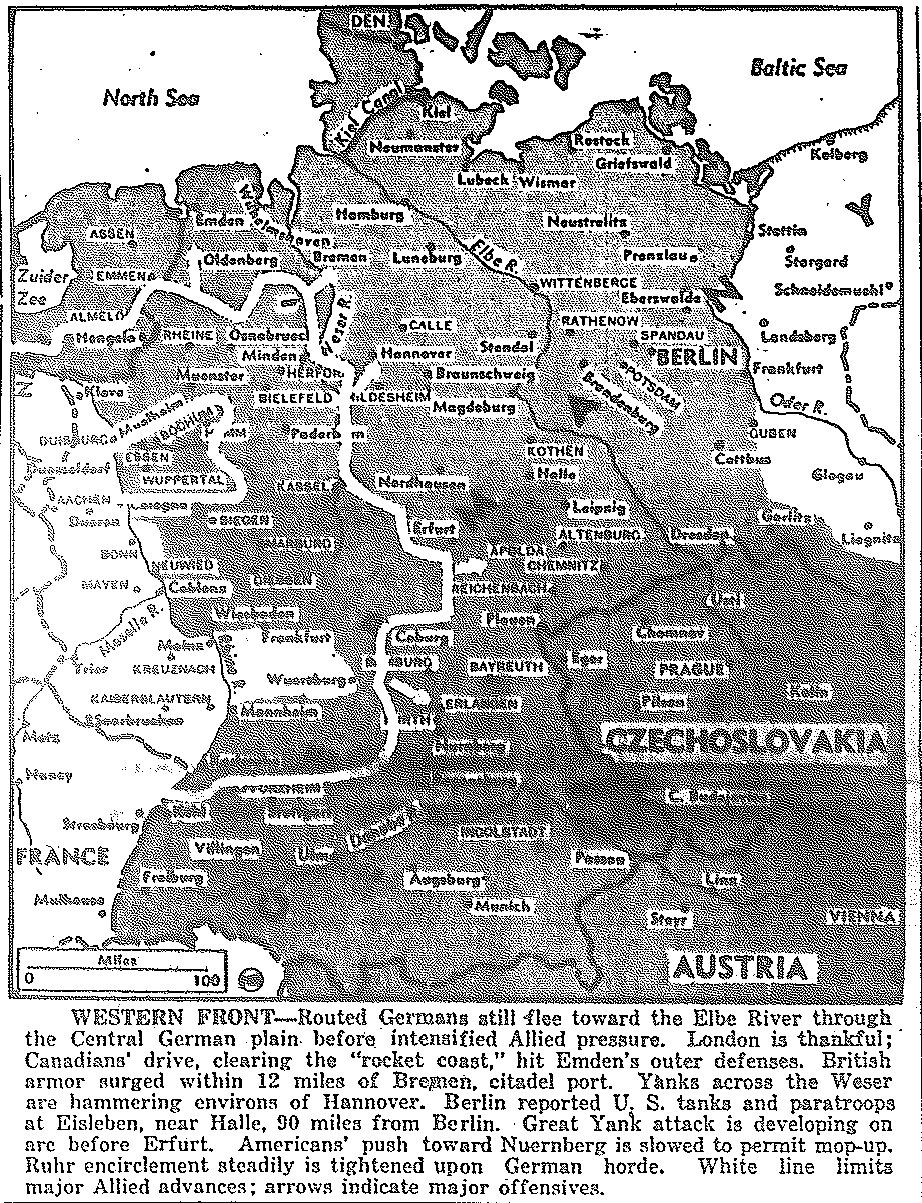 British close on Emden and Bremen; Americans move on Hannover and Eisleben, 90 miles from Berlin, published April 7, 1945