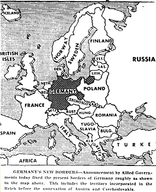 Map of Europe, Germany's new borders, reverts to 1937 territory, published June 5, 1945