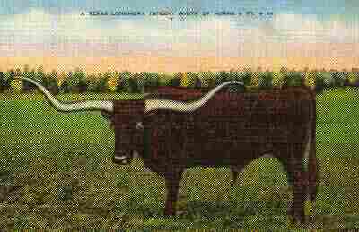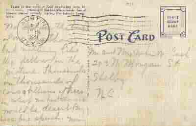 Front and back of postcard sent from Mary to in-laws Cash, postmarked at 1:30 p.m., June 2, 1941, about six hours before the speech. It reads: "We did see the bones of one shorthorn, but nothing like the fellow in the picture. Thousands on thousands of cows & billions of trees in what we had thought would be desert. Boy has a fine speech. Mary" This is one of two pieces of correspondence from Wilbur or Mary to anyone within the Cash family before his death four weeks later. (See the last letter from Cash to his parents in the Picture Gallery, 1941, page 3, at this site)
