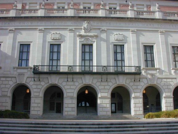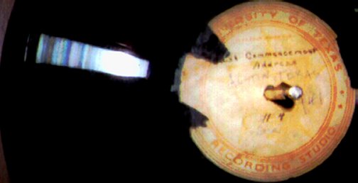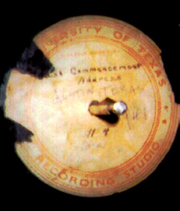 Cash's recent practice of elocution is evident in his last public address; he only occasionally stammers, never coughs, and effects a melodious delivery almost worthy of H.V. Kaltenborn. Looking from the steps of the Main Building toward the brightly lit State Capitol of Texas, he delivered the 28 minute speech to a graduating class of 1,339 white students and a total audience estimated at 10,000. (Like virtually all Southern colleges and universities of the time, Texas was still segregated and would remain so until the Supreme Court ruled in 1950 in the case of Sweatt v. Painter that the University must admit an African-American student to the law school because the one all-black law school in the state was found by the Court to be substantially unequal in available resources and thus violative of the old Plessy v. Ferguson "separate-but-equal" requirement for segregated public facilities--the standard foredone by this case and finally completely overturned in 1954 in Brown v. Board of Education. Thurgood Marshall, who in 1967 became the first African-American to be appointed to the U.S. Supreme Court, was lead counsel for the petitioners in both Brown and Painter.)