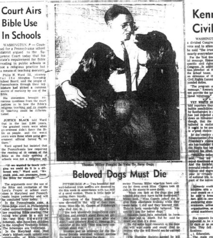 To the left of this column, one story over, appeared another front-page story, also from the Associated Press, "Court Airs Bible Use in Schools". That story read: