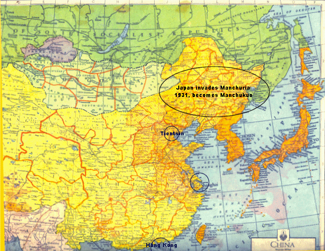 The maps below, (formed from images of three maps contained in Global Atlas of the World at War, 1944, World Publishing, NY), show the status of China in 1944, the orange section on the top map, including that with diagional lines, (darkened areas on second map), being under the control of Japan, (including Korea, under full Japanese control since 1910). Note also the Burma Road, marked in blue, in the lower middle section of the top map, leading from the Burmese railhead at Lashio, near Mandalay, (to which supplies would come by rail from the port of Rangoon directly south of Mandalay), to the Nationalist capital of China, "Chungking", (Chongquing). The second and third maps show a more expansive view, including the entire western Pacific rim and Dutch East Indies. The third map has the Philippines inset in the left top corner.